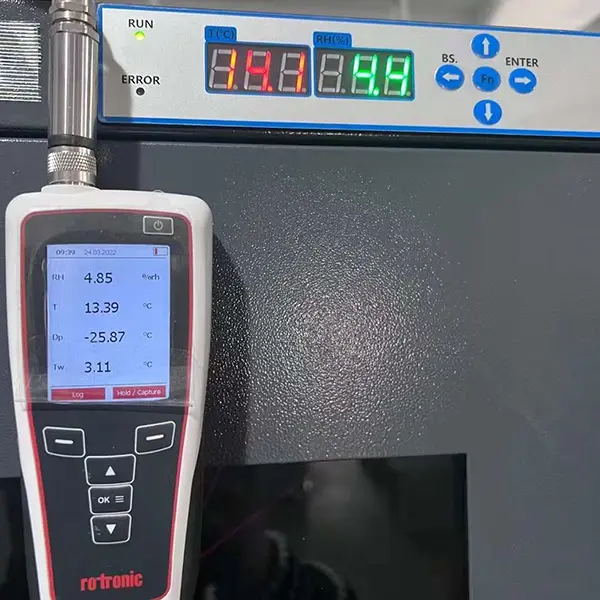 Prima di lasciare le fabbriche, ogni camera di prova e ogni armadio a secco vengono sottoposti a un test di invecchiamento continuo della durata di >48 ore. Ogni armadio a secco è accompagnato da un certificato di calibrazione, misurato da igrometri Rotronic ad alta precisione, e ogni camera di prova è accompagnata da un certificato di calibrazione a 9 punti, misurato da un laboratorio certificato ISO17025, tracciabile rispetto agli standard nazionali, garantendo che l'attrezzatura ricevuta fornisca prestazioni precise e "plug-and-play".