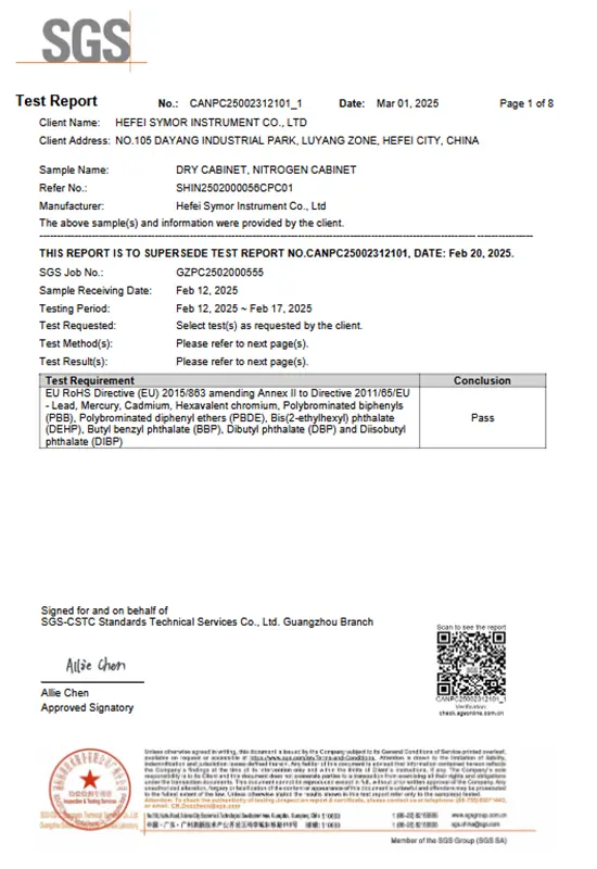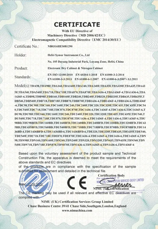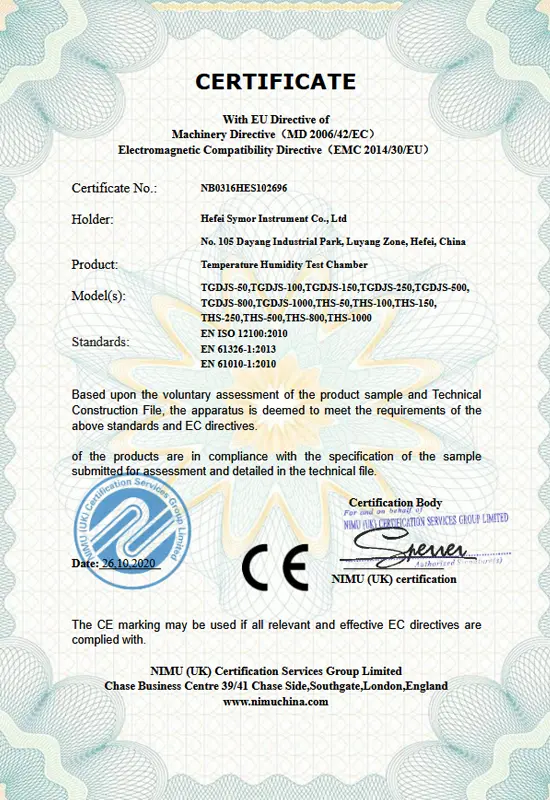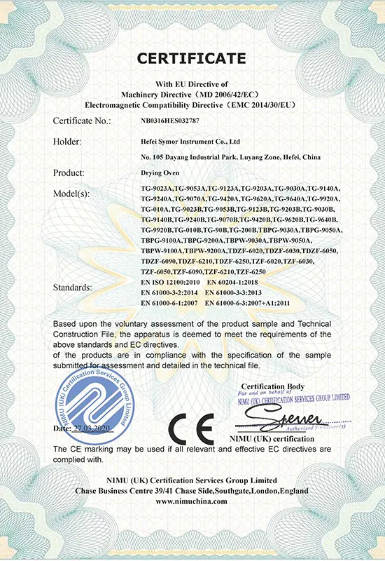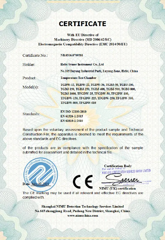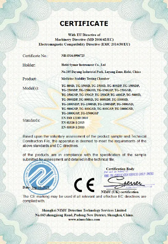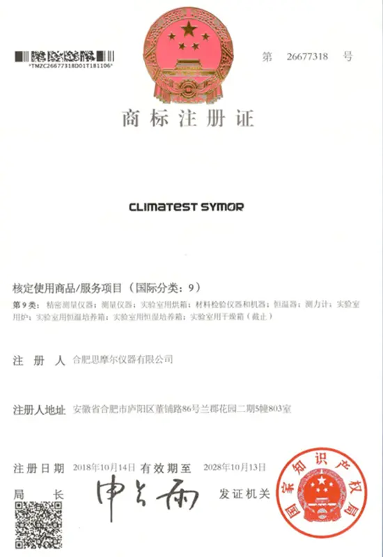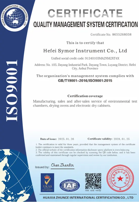 Il successo aziendale è legato alla qualità. Guidati da un rigoroso sistema di controllo qualità, ci impegniamo a fornire prodotti e soluzioni superiori e ci impegniamo a creare valore aggiunto per la nostra clientela globale. Symor Instrument Equipment Co., Ltd è certificata ISO 9001:2015, tutte le camere climatiche e gli armadi a secco sono approvati CE.